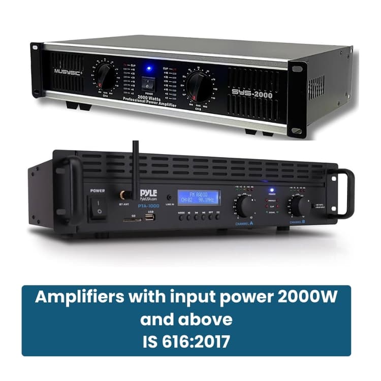 IS 616:2017 is an Indian Standard issued by the Bureau of Indian Standards (BIS) that specifies the safety requirements for audio, video, and similar electronic apparatus. This standard ensures that electronic devices used for sound and visual applications comply with essential electrical safety and quality requirements before being sold in the Indian market and obtaining BIS Certification for Amplifiers.