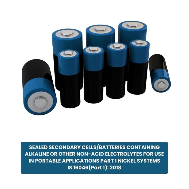 IS 16046 (Part 1):2018 is the Indian Standard that specifies safety requirements for sealed secondary nickel-cadmium batteries and cells used in portable electronic applications. This standard defines testing methods, safety parameters, and performance requirements that ensure batteries operate safely and efficiently during their lifecycle.