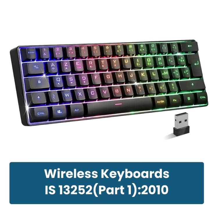 IS 13252 (Part 1): 2010 is the Indian Standard issued by the Bureau of Indian Standards (BIS) that specifies the safety requirements for Information Technology equipment, including wireless keyboards. Under the Compulsory Registration Scheme (CRS), manufacturers and importers must ensure that wireless keyboards comply with this standard before they can be sold in the Indian market.