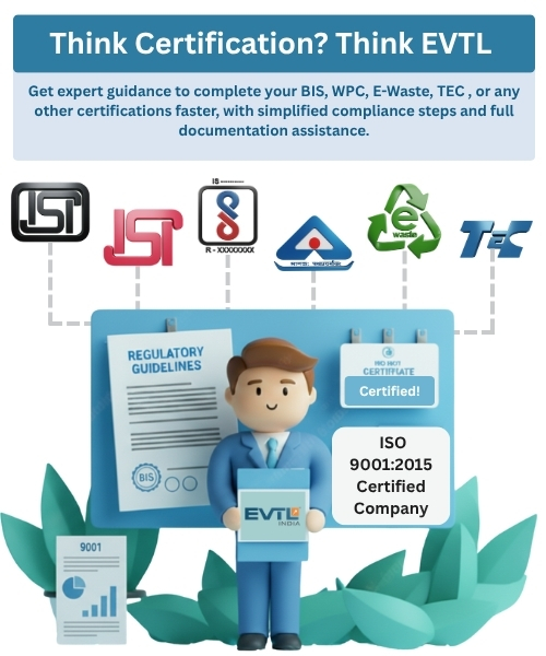 At every stage of compliance, the knowledgeable consultants at EVTL INDIA are prepared to help, offering you the best services available in India. Obtain comprehensive details regarding the certification required for your product to join the Indian market and develop a strong customer base.