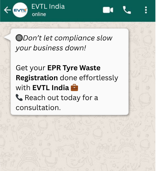Looking to obtain EPR Registration for Waste Tyres? You’re in the right place. EVTL India is a leading EPR registration consultancy in India, specializing in helping businesses involved in waste tyre management secure their EPR certificates. Our team of experts is available 24/7 to provide hassle-free and timely assistance, ensuring a smooth and efficient registration process.